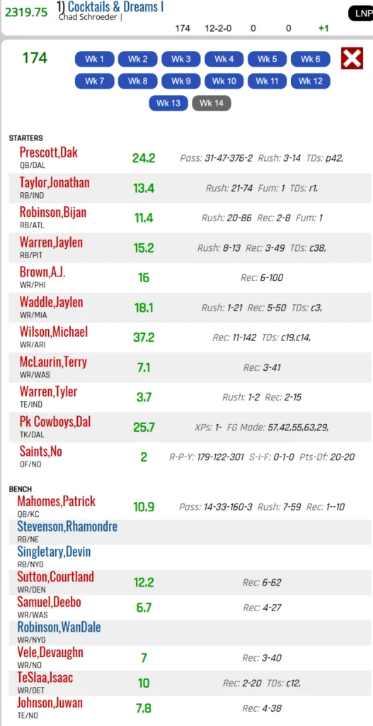 #1 Chad Schroeder — The World’s #1 Ranked Player (He hates it when we call him that) cements his dominance with a stunning 1st place overall regular season finish! This week’s 174-point explosion (averaging 165.7 FPs weekly) on a 12-2 record showcases his genius. Starting Dak over Mahomes was a masterstroke, backed by a powerhouse lineup: J Taylor, Bijan, Jaylen Warren, AJ Brown, Waddle, McLaurin, and the breakout star Michael Wilson. TE, Rookie Tyler Warren. Losing Colts’ Jones is a blow, but this team’s playmakers are ready to soar!