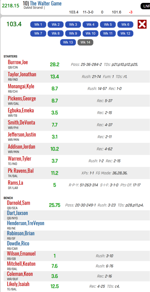 #10 David Strand — The Walter Game has some serious depth. Burrow/Darnold/Dart at QB, J Taylor / Monangai with TreVeyon and Dowdle on the bench. At WRs: Jetta, Pickens, Egbuka, and Devonta Smith. Tyler Warren at TE rounds out this explosive roster—a wildcard ready to climb.