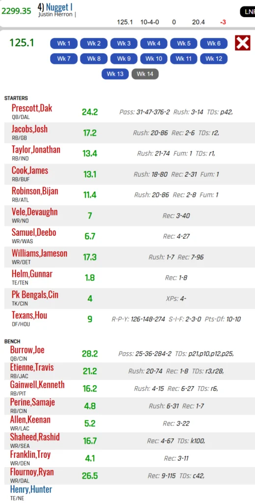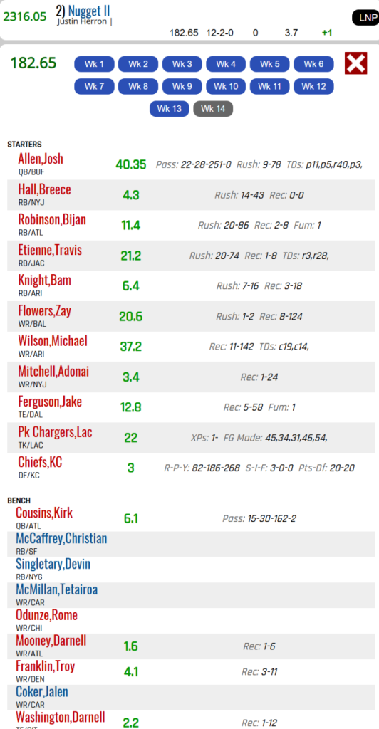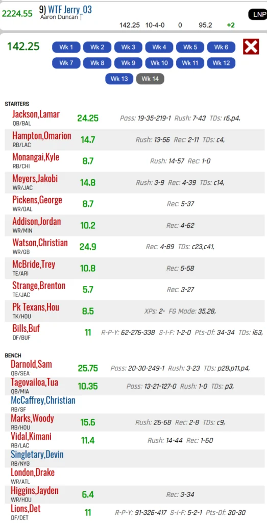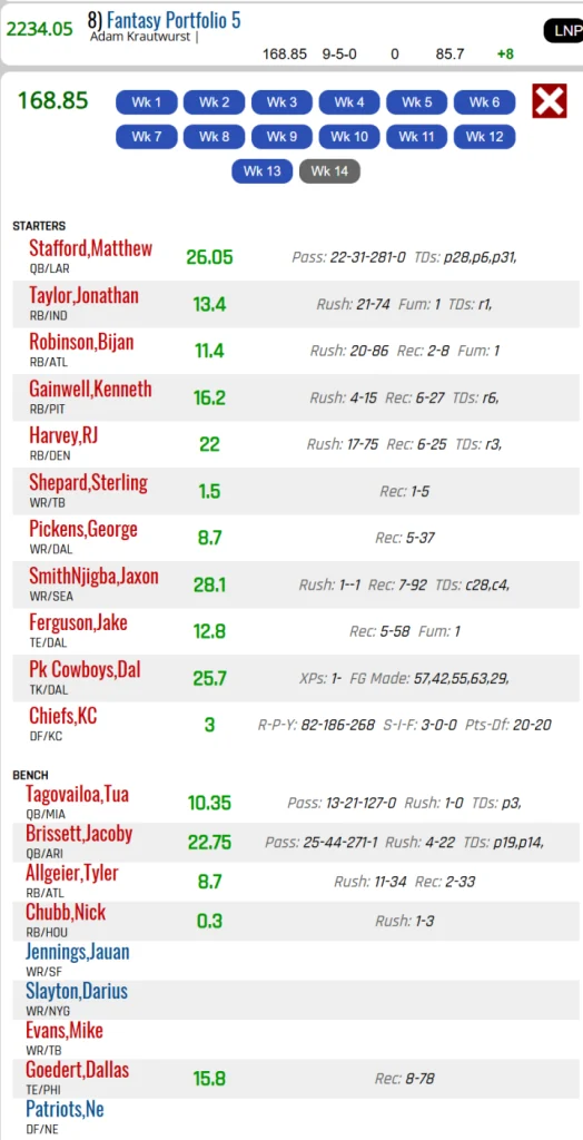 #8 Adam Krautwurst @Adam K on Discord— A meteoric 8-spot rise this week! Stafford/Brissett combo, J Taylor (very popular in the top 10) / Bijan / Harvey / Gainwell for RBs. JSN, Pickens, and Ferguson, with Evans and Goedert on the bench—If Evans returns to form, this team could be extra dangerous.