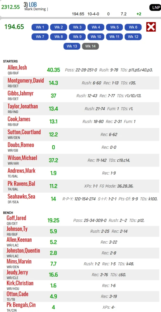 #3 Mark Deming LOB — A colossal 194-point week propels him to 3rd! With Josh Allen, Gibbs, J Taylor, Cook, and Michael Wilson, this roster is a scoring machine with a real chance to nuke.