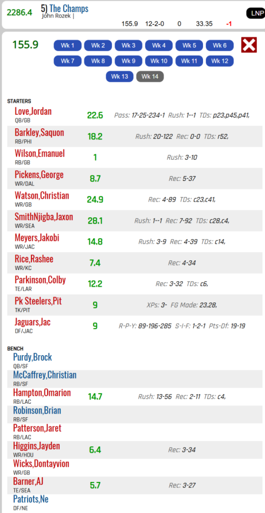 #5 John Rozek’s The Champs — Jordan Love, Barkley, Pickens, Watson, and the #1 overall WR Jaxson Smith-Njigba (finally an appearance at the top of the leaderboard) lead the charge. Rashee Rice, Jakobi Meyers, with CMC and Omarion Hampton on the bench—this team is a playoff predator with uncommon heroes.