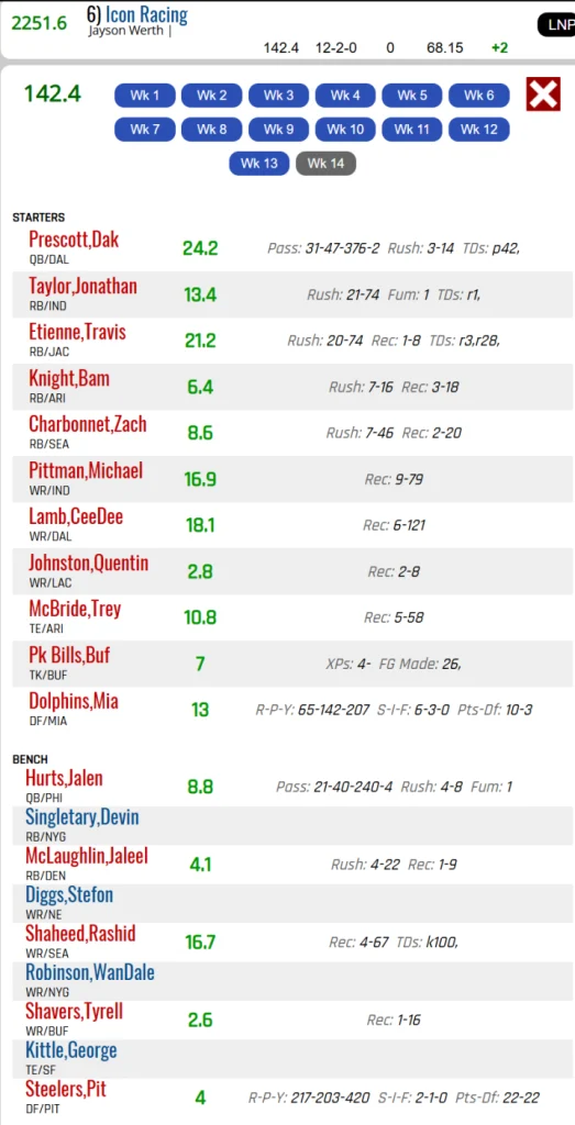 #6 Icon Racing (Jayson Werth) — MLB superstar Werth shines with a smart Dak-over-Hurts call. J Taylor/ETN, Lamb, Pittman, and Trey McBride, with Diggs and Kittle benched. Could he do the unthinkable and cross over from legendary baseball status to fantasy football phenom?