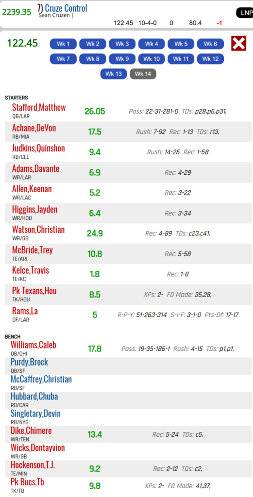 #7 Sean Cruzen — The veteran is back and 2025 may be a year for the record books for his teams. This one has a Stafford/Caleb combo at QB. Achane (status questionable but should go), the rookie Judkins (CMC benched) trio of backs. Devante Adams, Christian Watson, and Travis Kelce form a dominant lineup. May be a little thin but a season of brilliance continues!